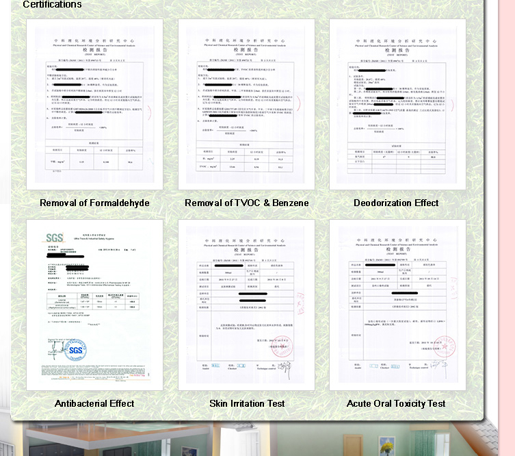 - Natural ingredients extracted from a variety of plants, including Gleditsia sinensis, Sophora flavescens, aloe vera, peel of fresh Fortunella japonica, etc - Can effectively remove benzene, TVOC, ammonia and most of the odors, also have effects on the elimination of formaldehyde - No chemical ingredients, safe, odorless, with disinfection effects - Self-degradation, will not cause secondary pollutions |